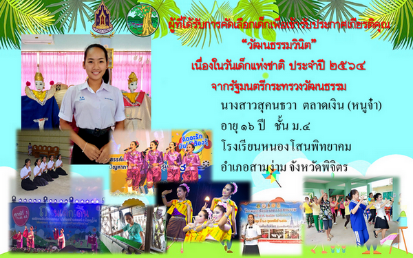 จังหวัดพิจิตร ได้ดำเนินการคัดเลือกเด็กเพื่อเข้ารับประกาศเกียรติคุณ “วัฒนธรรมวินิต”เนื่องในงานวันเด็กแห่งชาติ ประจำปี ๒๕๖๔ จากรัฐมนตรีกระทรวงวัฒนธรรม เมื่อวันอังคารที่ ๑๙ มกราคม ๒๕๖๔ เวลา ๐๙.๓๐ น. ณ ห้องประชุมสำนักงานวัฒนธรรมจังหวัดพิจิตร ชั้น ๒ ศาลากลางจังหวัดพิจิตร (หลังเดิม) ถนนบุษบา ตำบลในเมือง อำเภอเมืองพิจิตร จังหวัดพิจิตร โดยมีเด็กนักเรียนเสนอผลงาน รวมจำนวน ๑๔ ราย และผู้ที่ได้รับการพิจารณาคัดเลือกเด็กเพื่อเข้ารับประกาศเกียรติคุณ “วัฒนธรรมวินิต”เนื่องในงานวันเด็กแห่งชาติ ประจำปี ๒๕๖๔ จากรัฐมนตรีกระทรวงวัฒนธรรม คือ นางสาวสุคนธวา ตลาดเงิน ชั้นมัธยมศึกษาปีที่ ๔ โรงเรียนหนองโสนพิทยาคม อำเภอสามง่าม จังหวัดพิจิตร